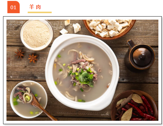 羊肉性温补,是最适合冬季食用的肉类之一。现代中医认为:适时地多吃羊肉,可以增加消化酶,保护胃壁,帮助消化,还能起到补气、御寒的功效。但要注意,羊肉多吃容易上火,应当控制食量,最好与萝卜等蔬菜一起搭配着吃。