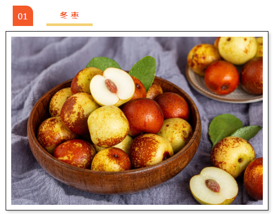 新鲜的冬枣中含有丰富的维生素C,维生素C是一种有效的抗氧化剂,经常食用有一定程度上的抑制皮肤黑色素的功效。此外,冬枣味甘性温,是补中益气,养血安神的佳品。